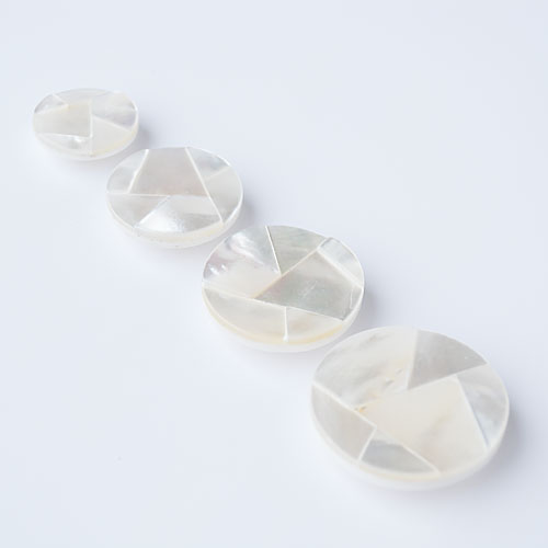 天然素材の貝を使用し、一つ一つ手加工でモザイク状にカットし貼り合わせたボタンです。モザイク加工により、見る角度によって、貝の光沢がより一層引き立つデザインのボタンです。
