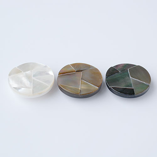 天然素材の貝を使用し、一つ一つ手加工でモザイク状にカットし貼り合わせたボタンです。モザイク加工により、見る角度によって、貝の光沢がより一層引き立つデザインのボタンです。