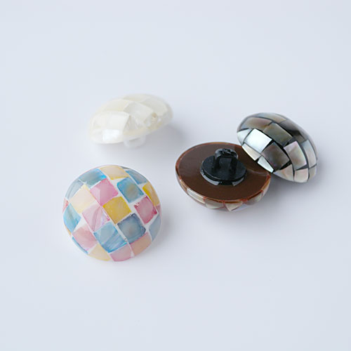 天然素材の貝を使用し、モザイクタイルのように貝を一つ一つ手加工で貼り合わせたボタンです。モザイク加工により、見る角度によって、貝の光沢がより一層引き立つ丸く可愛いボタンです。