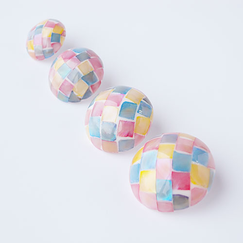 天然素材の貝を使用し、モザイクタイルのように貝を一つ一つ手加工で貼り合わせたボタンです。モザイク加工により、見る角度によって、貝の光沢がより一層引き立つ丸く可愛いボタンです。