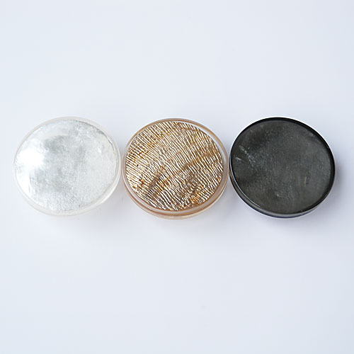 天然素材の貝シート(カピスシェル)を透明ポリエステルのボタンに閉じ込めました。