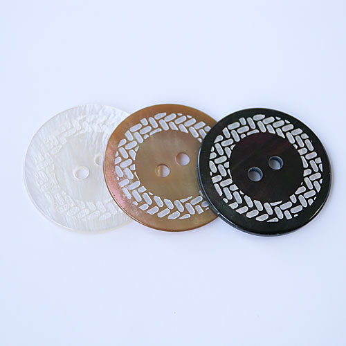 天然素材の貝ボタンに、月桂のような模様を彫刻で施しました。