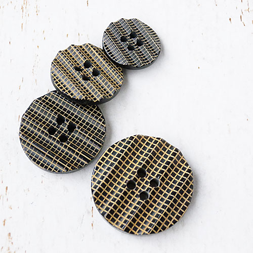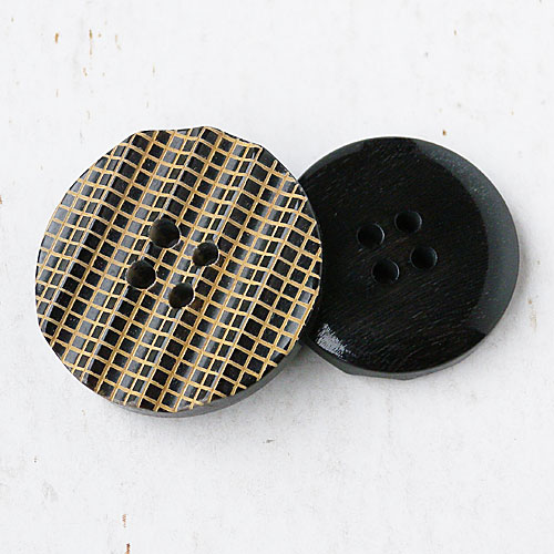 本水牛の表面を波板状に加工し、網目模様を彫刻した、手の込んだボタンです。