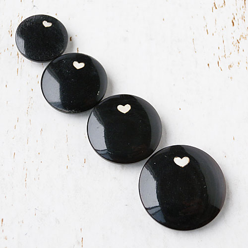 本水牛のシンプルな裏穴ボタンに、ハート型の貝パーツを象嵌した、繊細なボタンです。