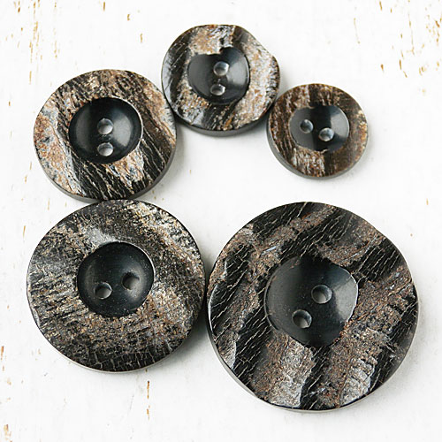 本水牛の表面の模様を生かした、ゴツゴツとした肌合いのボタンです。