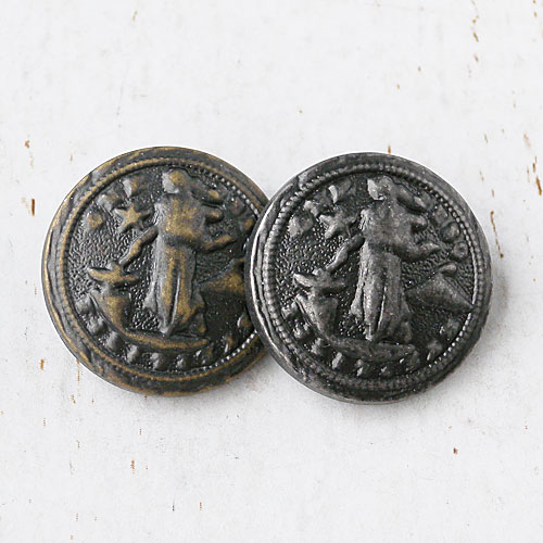 古いコインのような色とレリーフ模様が特長のボタンです。