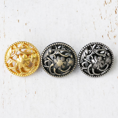 表と裏に、ボタニカル柄の透かし模様を施した、レトロな雰囲気のボタンです。