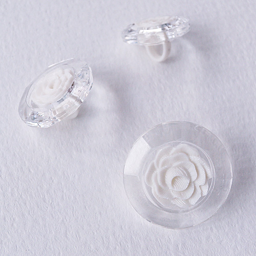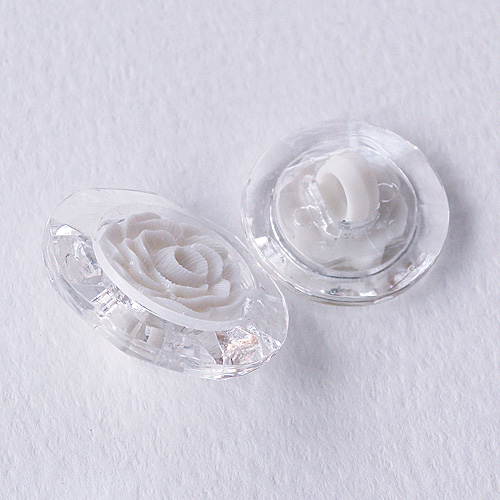 カットをあしらった透明ボタンにバラの花を組合わせたボタンです。軽量でブラウスやアクセサリーにおススメです。