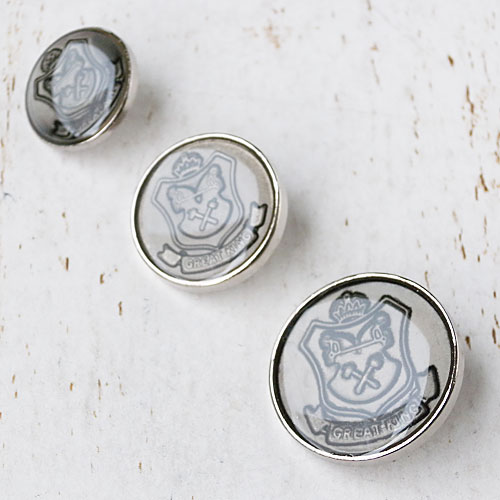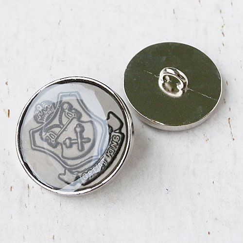 エンブレムのレリーフ模様を、透明エポキシ樹脂でコーティングしたメタルボタンです。