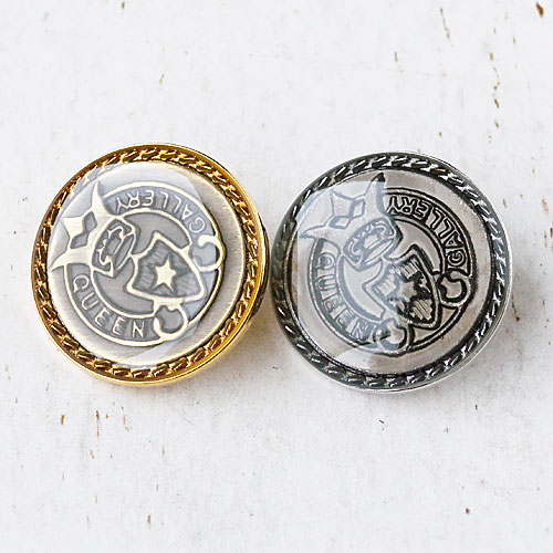 エンブレムのレリーフ模様を、透明エポキシ樹脂でコーティングしたメタルボタンです。