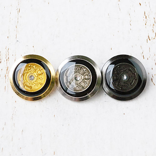 エンブレムのレリーフ模様とラインストーンを組合せ、黒と透明のエポキシ樹脂でコーティングしたメタルボタンです。