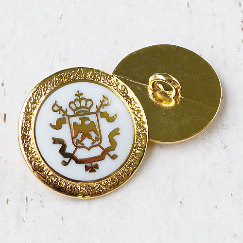 エンブレム模様のまわりに白いエポキシ樹脂を流し込み、コントラストをの美しいメタルボタンに仕上げました。