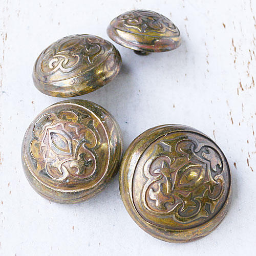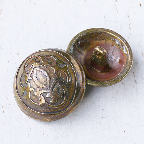 紋章のような模様をデザインしたボタンで、色により様々なアンティーク加工を施しています。