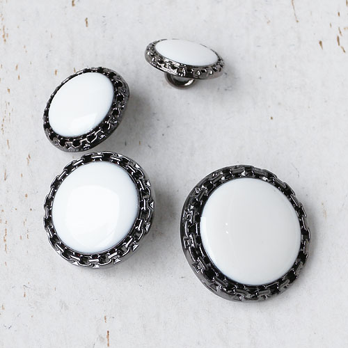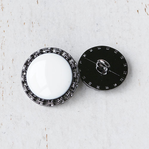 細かなチェーン模様の土台に、白いエポキシ樹脂をぷっくりとのせた、お花のようなボタンです。