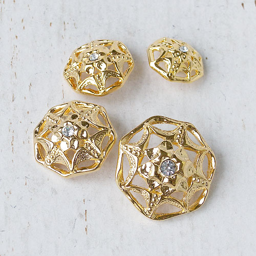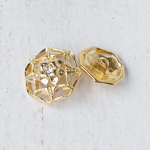 蜘蛛の巣をイメージさせるほど、細い透かしが特徴のメタルボタンです。中央のラインストーンが妖艶なきらめきを放つ、不思議な魅力を持ったボタンです。