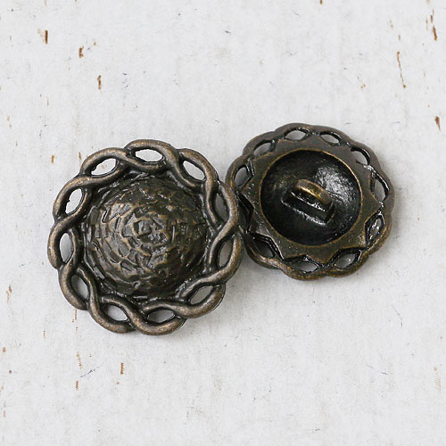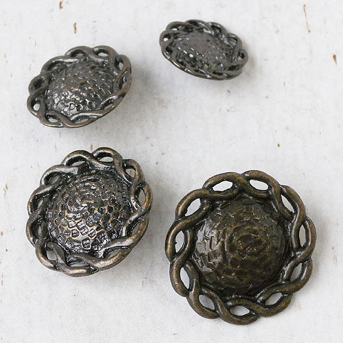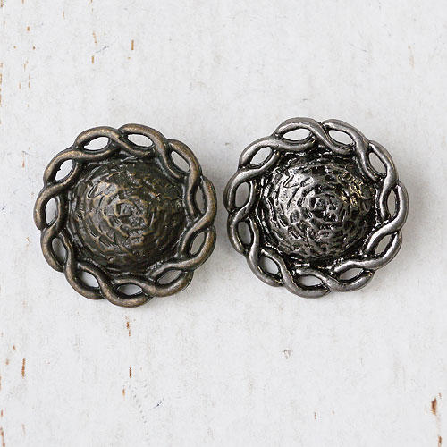 鎚目のテクスチャーと縄目のレリーフを際立たせる、古美加工仕上げのボタンです。昔の青銅器のような重厚感を感じられるボタンです。