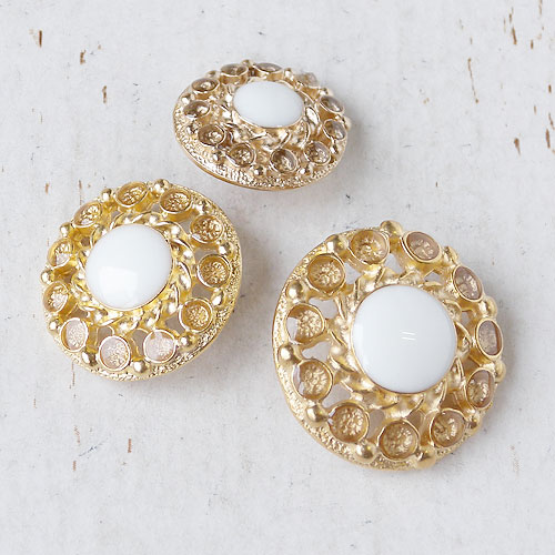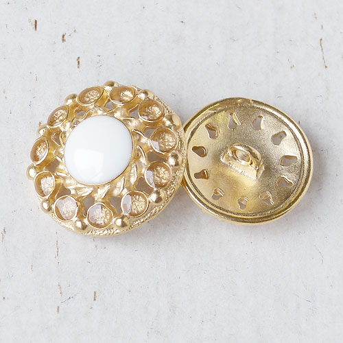 繊細な透かしの上に、中央には白いエポキシ樹脂を、周りには透明エポキシ樹脂を施して、質感の違う輝きが楽しめるメタルボタン仕上げました。