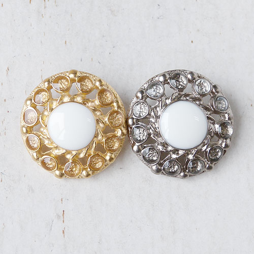 繊細な透かしの上に、中央には白いエポキシ樹脂を、周りには透明エポキシ樹脂を施して、質感の違う輝きが楽しめるメタルボタン仕上げました。